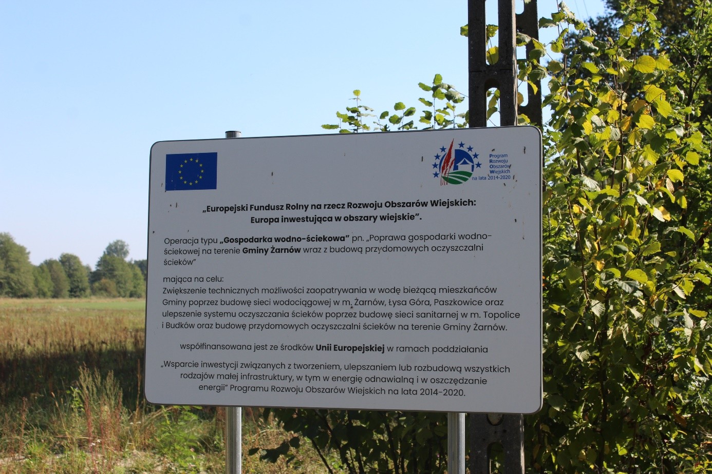 W wyniku realizacji operacji osiągnięty został następujący cel określony w umowie o dofinasowanie: zwiększenie technicznej możliwości zaopatrywania w wodę bieżącą mieszkańców Gminy poprzez budowę sieci wodociągowej w m. Żarnów, Łysa Góra, Paszkowice, oraz ulepszenie systemu oczyszczania ścieków poprzez budowę sieci kanalizacji sanitarnej w m. Topolice i Budków oraz budowę przydomowych oczyszczalni ścieków na terenie Gminy Żarnów.
