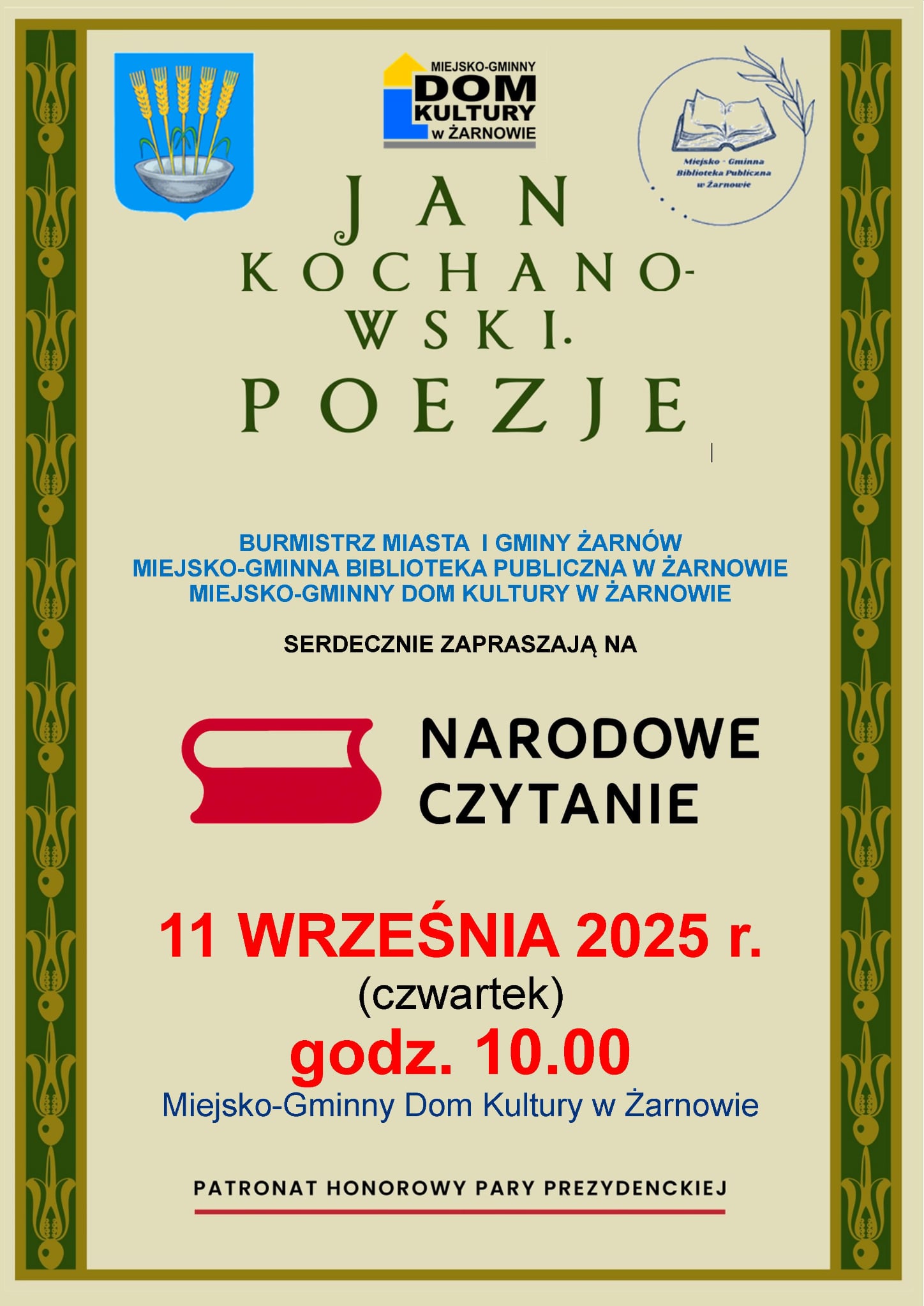Mieszkańcy Gminy Żarnów! Miłośnicy literatury i poezji! W czwartek, 11 września 2025 roku o godz. 10.00 zapraszamy do Domu Kultury w Żarnowie na „Narodowe czytanie `2025”.