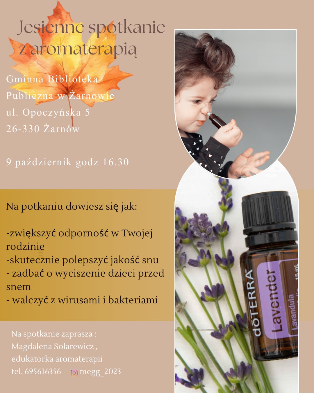 Wszystkich zainteresowanych poznaniem tajników aromaterapii, prosimy o zapoznanie się z plakatem i zapraszamy w czwartek, 9 października 2025 roku do Miejsko – Gminnej Bibliotece Publicznej w Żarnowie (ul. Opoczyńska 5).