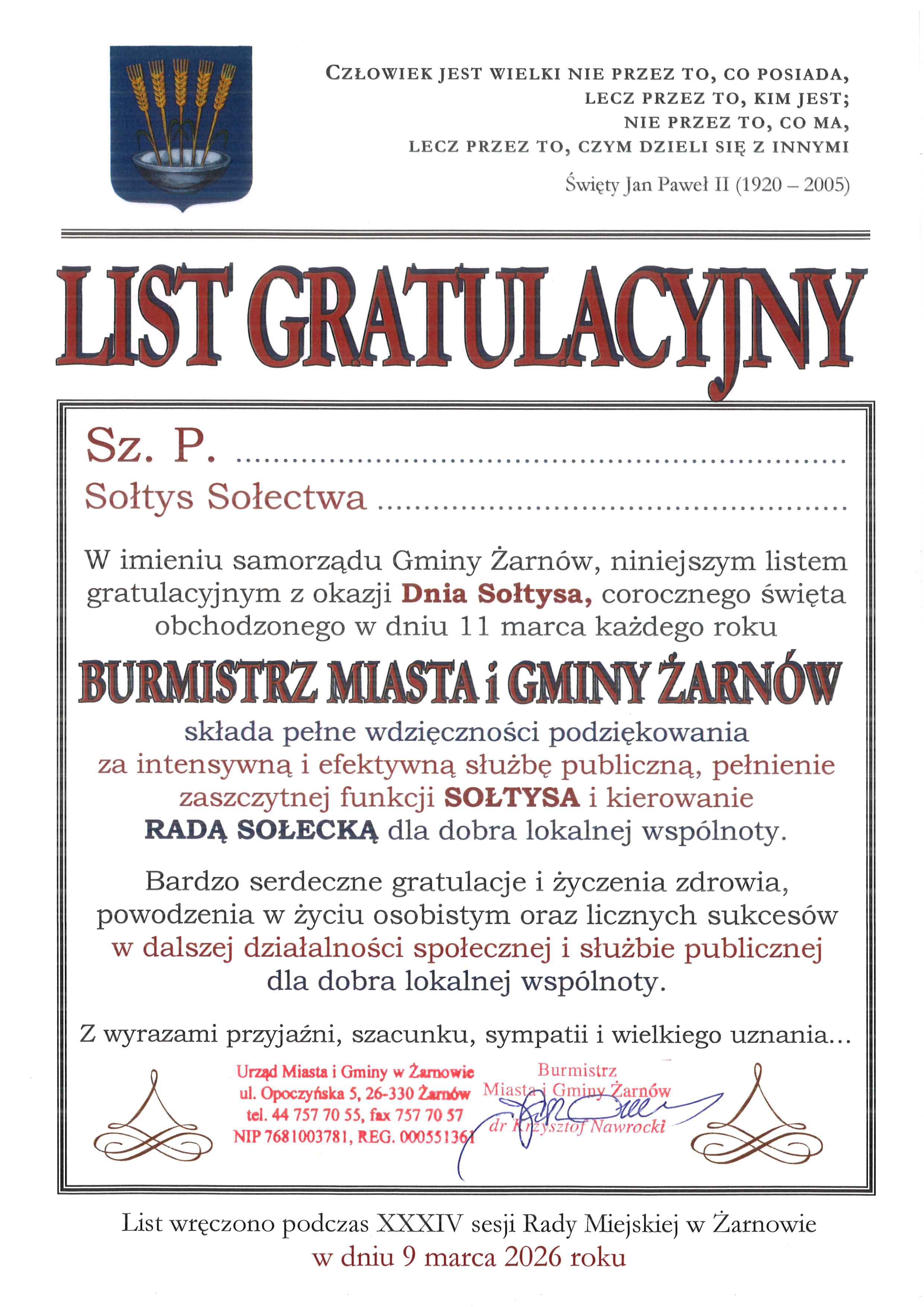 Drodzy Sołtysi! To od Waszego uporu, determinacji, zaangażowania i inicjatyw, zależy stale zmieniający i piękniejący wizerunek naszych sołectw w Gminie Żarnów. Obyście potrafili unieść się ponad podziały i stworzyć w Waszych rodzinnych miejscowościach jedną wielką rodzinę, którą więcej łączy niż dzieli. Wszystkiego najlepszego z okazji Waszego Święta…